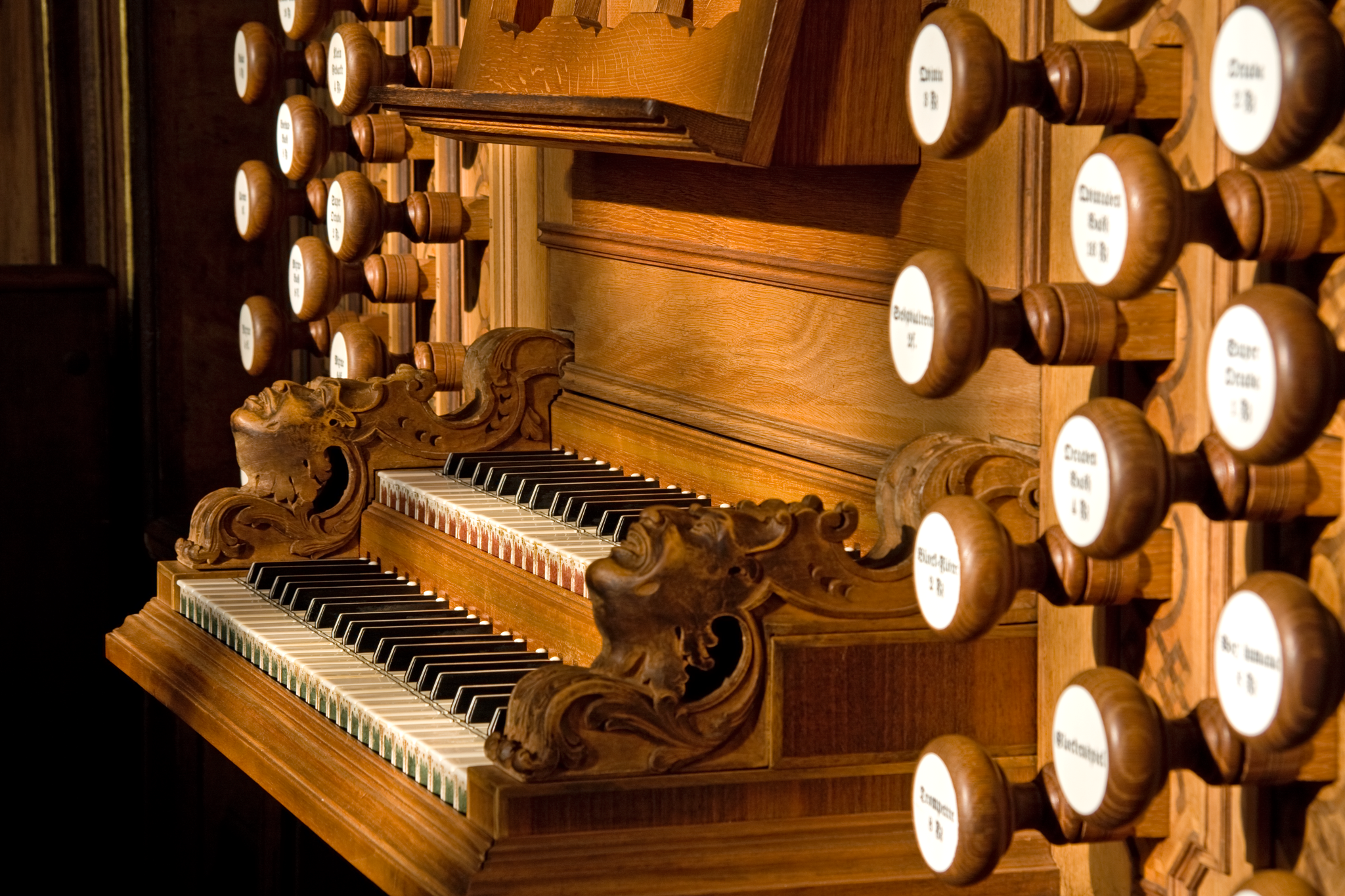 Geigenprincipal 8', Lieblich Gedackt 8', Vugara 8', Quintadena 8', Hohlflöte 8', Gemshorn 4', Flaute douce 2f. 4', Nasat 3', Octave 2', Waldflöte 2', Superoctava 1', Cornet 5f., Mixtur 4-5f. 2', Vox humana 8', Tremulant