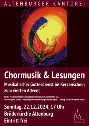 Einen ganz besonderen Gottesdienst können Sie am 4. Advent in der Altenburger Brüderkirche erleben. Im Kerzenschein singen die Altenburger Kurrende und Kantorei unter Leitung von Johann Friedrich Röpke weihnachtliche Weisen. Dazu liest Sandro Vogler passende Texte.