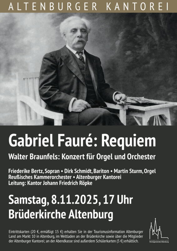 Zum Ende des Kirchenjahres präsentiert die Altenburger Kantorei Faurés Requiem. Es beeindruckt mit schlichten, klaren, nahezu himmlischen Klängen und nimmt den Zuhörer mit in eine andere Welt. Als Solisten sind Friederike Bertz (Sopran) und Dirk Schmidt (Bariton) zu erleben. Das zweite Werk stammt von Werner Braunfels, der durch die Nazis verboten wurde und bis heute nur wenigen bekannt ist. Sein beeindruckendes Orgelkonzert wird der hervorragende Organist Prof. Martin Sturm aus Weimar präsentieren. Es begleitet das Reußische Kammerorchester unter Leitung von Kantor Johann Friedrich Röpke. Karten gibt es in der Tourismusinformation Altenburger Land, im Weltladen an der Brüderkirche sowie an der Abendkasse.
